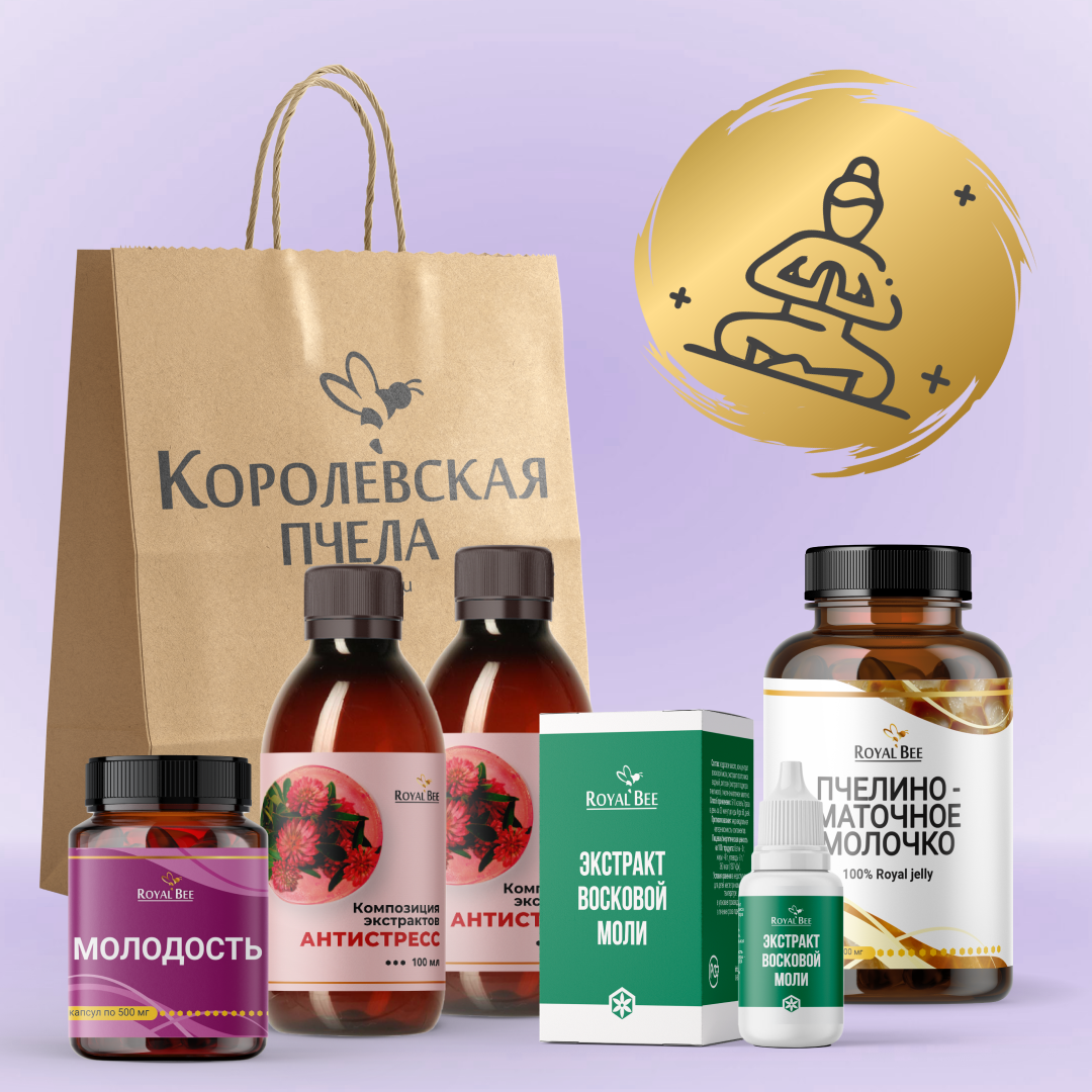 ЭКСТРАКТ ВОСКОВОЙ МОЛИ, 15 мл (1 шт.), МОЛОДОСТЬ в капсулах, 40 шт. (1 шт.), 100% Пчелино-маточное молочко В КАПСУЛАХ, 60 шт. (1 шт.), Композиция экстрактов "Антистресс", 100 мл (2 шт.), Крафтовый пакет (1 шт.). |
