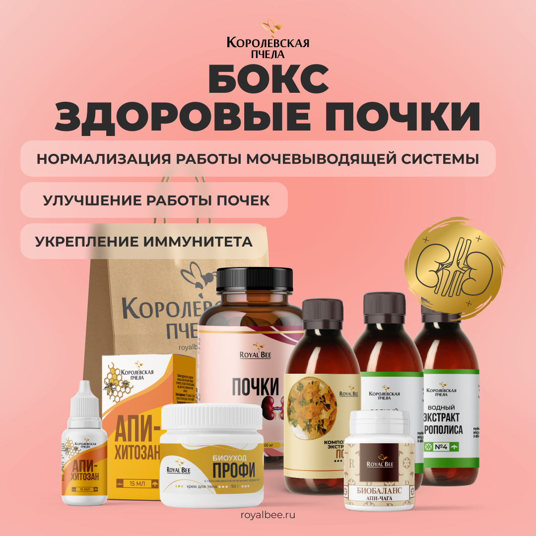 АПИ-ХИТОЗАН, 15 мл (1 шт.), Апи-комплекс для ПОЧЕК, 60 капсул (1 шт.), Композиция экстрактов "Почки", 100 мл (1 шт.), Экстракт прополиса водный №4, 100 мл (2 шт.), Крем для тела "Биоуход" ПРОФИ, 50 г (1 шт.), Апи-чага, 20 г (1 шт.), Крафтовый пакет (1 шт.) |