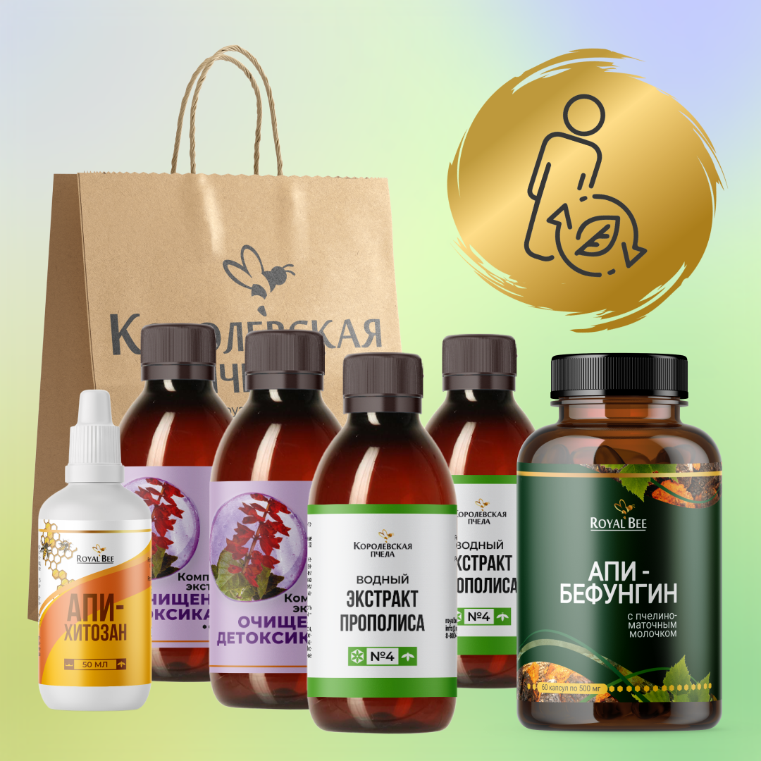 КОМПОЗИЦИЯ ЭКСТРАКТОВ "ОЧИЩЕНИЕ И ДЕТОКСИКАЦИЯ", 100 мл (2 шт.), ЭКСТРАКТ ПРОПОЛИСА ВОДНЫЙ №4, 100 мл (2 шт.), АПИ-ХИТОЗАН, 50 мл (1 шт.), АПИ-БЕФУНГИН, 60 капсул (1 шт.), Крафтовый пакет (1 шт.) |