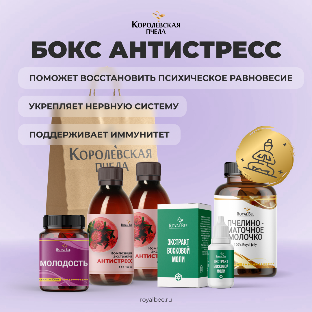 БОКС "АНТИСТРЕСС" от "Королевской пчелы" поможет вам восстановить психическое равновесие и почувствовать себя спокойнее и гармоничнее!