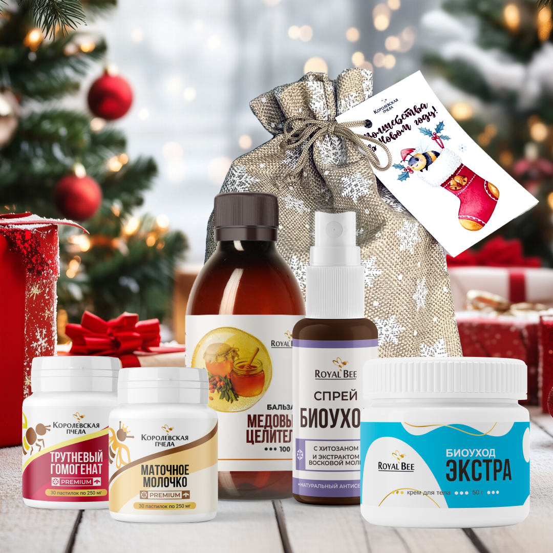 МАТОЧНОЕ МОЛОЧКО PREMIUM, 30 пастилок (1 шт.), ТРУТНЕВЫЙ ГОМОГЕНАТ PREMIUM, 30 пастилок (1 шт.), БАЛЬЗАМ "МЕДОВЫЙ ЦЕЛИТЕЛЬ", 100 мл (1 шт.), КРЕМ "БИОУХОД" ЭКСТРА, 50 г (1 шт.), СПРЕЙ "БИОУХОД" С ХИТОЗАНОМ И ЭКСТРАКТОМ ВОСКОВОЙ МОЛИ, 50 мл (1 шт.), ЛЬНЯНОЙ МЕШОЧЕК НОВОГОДНИЙ (1 шт.) |