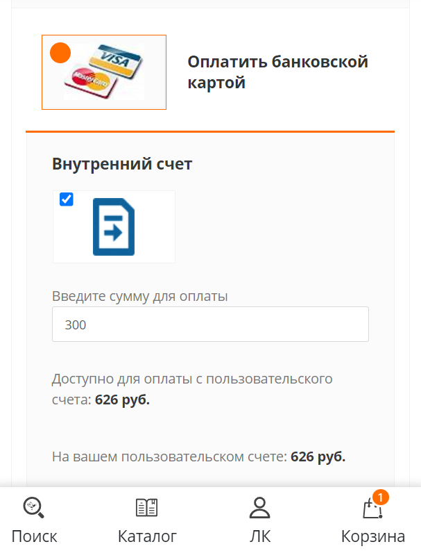 Кроме того, вы можете потратить не всю сумму из внутреннего счета, указав в окошке желаемую сумму. Например, у вас на счете 626 руб. и вы хотите потратить 300. Указываем в окне сумму 300 руб. и именно эта сумма спишется с вашего внутреннего счета.